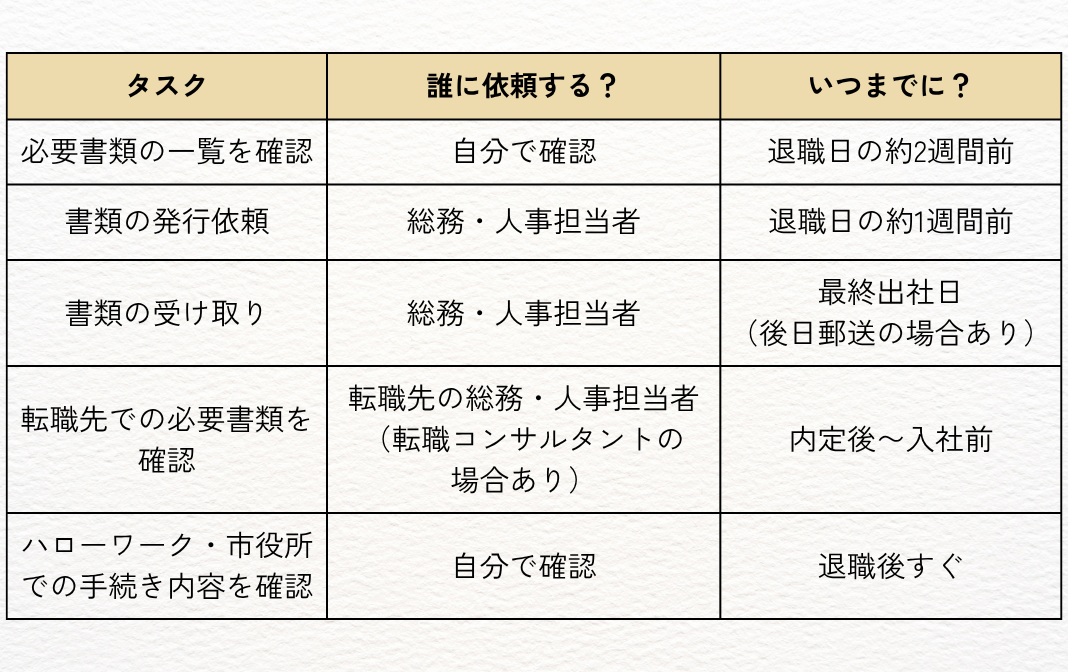 退職時に揃える書類は企業側で整えてもらえるのが基本ではありますが、いつ・何が必要なのかは自分の責任でしっかりと確認をしておいてくださいね。