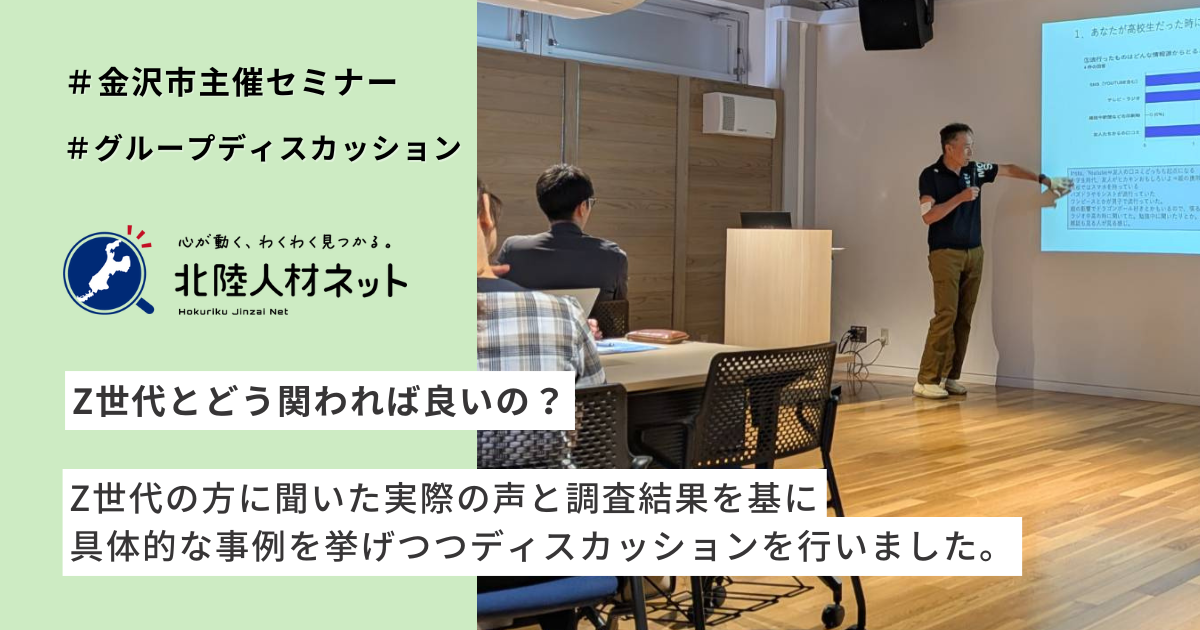 2025/09/25 イベントレポ 9/25 金沢市主催「Z世代との関わり方」講座を開催しました イベントレポート 「もう迷わない Z世代との関わり方講座を開催しました|金沢市商工労働課様」を公開しました! 次の記事へ 一覧へ戻る